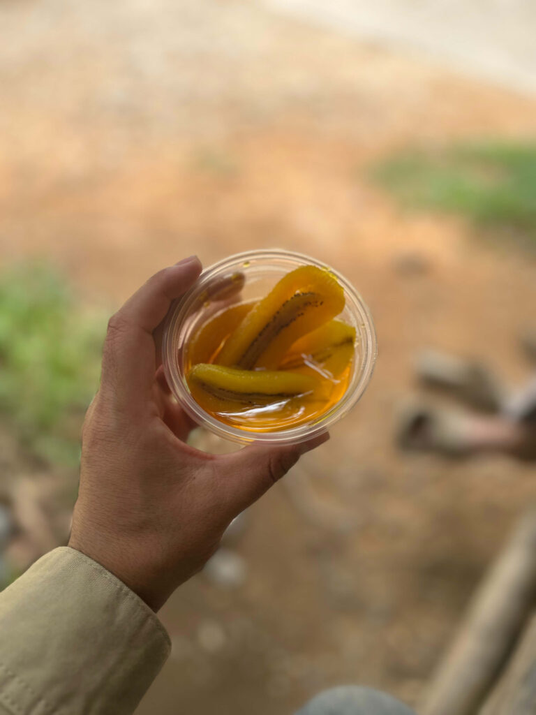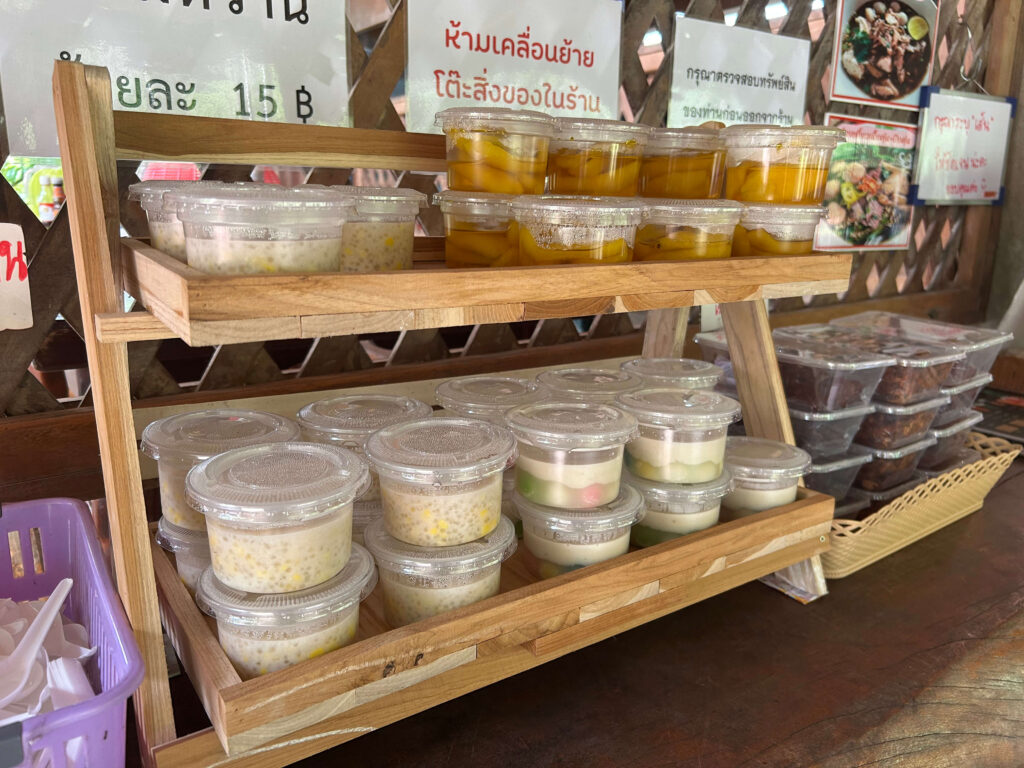 นอกจากก๋วยเตี๋ยวที่แซ่บถึงใจแล้ว ที่ก๋วยเตี๋ยวบ้านลิมุดยังมีเมนูของหวานและเครื่องดื่มที่น่าสนใจไม่แพ้กันครับ เมนูของหวานของที่นี่จะจัดแยกเป็นถ้วยๆ ทำให้เลือกทานได้สะดวก สาระรีฟได้ลองสั่ง “กล้วยเชื่อม” และ “ข้าวโพดสาคู” มาลองครับ ทั้งสองเมนูรสชาติอร่อย หวานกำลังดี ทานแล้วชื่นใจมากๆ ครับ!